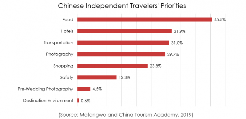 Interest in shopping has been decreasing, says the report, and the quality of travel experiences is now something that FITs think about over safety issues. This is significantly different to past surveys of Chinese travelers, where safety usually ranked first. Mafengwo users, and FITs in general, are more likely to be experienced, adventurous travelers who have been abroad and consider most of their potential travel destinations to be safe enough already that they can worry more about eating well and taking great photos to share on WeChat Moments.
