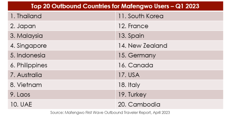 So far in 2023, Mafengwo users have visited more than 150 countries and 1,800 cities around the world. The top outbound countries reflect the strength of Southeast Asia as a travel destination, the appeal of Western Europe to Chinese travelers, Australia’s sustained top-billing as a long-haul destination, and the positive impacts of recovered flight connectivity and visa-free travel to the UAE.