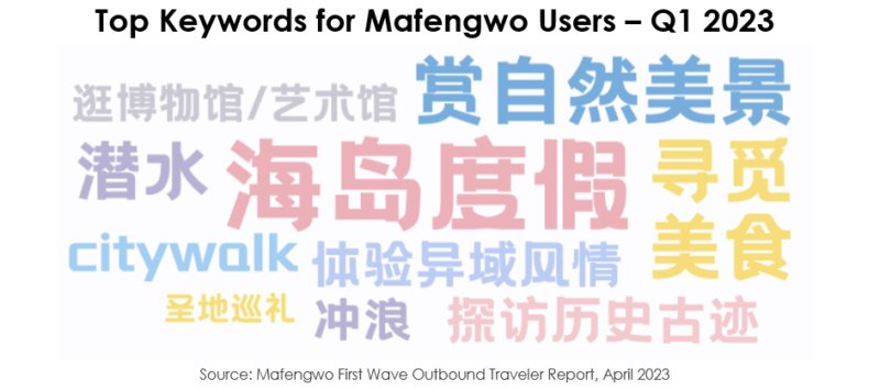 The top 10 key words and phrases on Mafengwo, reflecting trends for young outbound travelers, are: beach and island vacation, appreciating natural beauty, dining, diving, history and heritage, citywalk, experiencing foreign cultures, surfing, museums, holy sites.