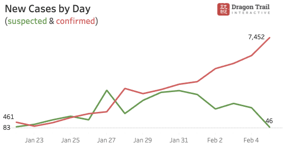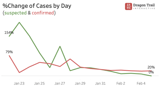 According to Chinese authorities, those who were infected but initially not showing symptoms should already be detected and isolated. For people carrying the virus who left the region before January 23, they also have shown symptoms by now. Looking at growth rates of total confirmed and suspected cases, there has been less fluctuation since January 29, with a consistent decline. Additionally, we are noticing that new suspected cases have been dropping since January 31, meaning fewer people are showing symptoms, and those infected are being diagnosed. When newly confirmed cases and suspected cases both start to drop consistently, it will be safe to assume the virus have reached its peak.