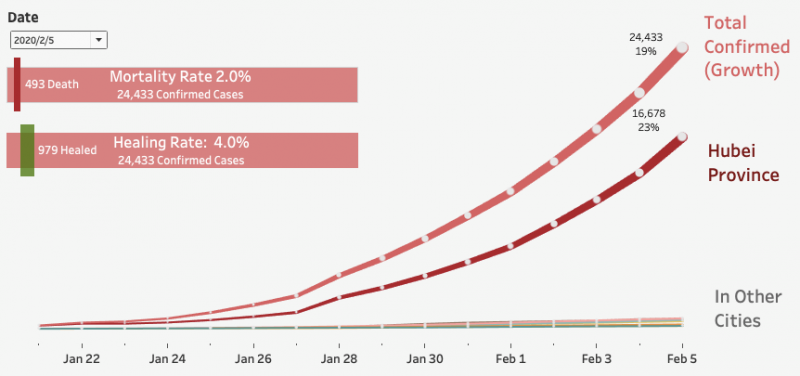 By Feb 5, domestically confirmed cases have reached 24,433, with 493 deaths. Globally, the nCoV has spread to 24 countries, with 175 confirmed cases and 1 death (in the Philippines). With Wuhan and 15 surrounding cities quarantined since Jan 23, the 14-day incubation period ends on Feb 6. By now, 68% of global total confirmed cases are contained in Hubei province.