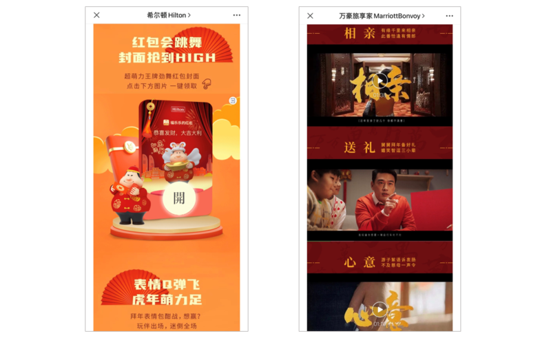 Top WeChat posts from Hilton (left) and Marriott came out for Chinese New Year, with video content, digital red envelopes, stickers and more