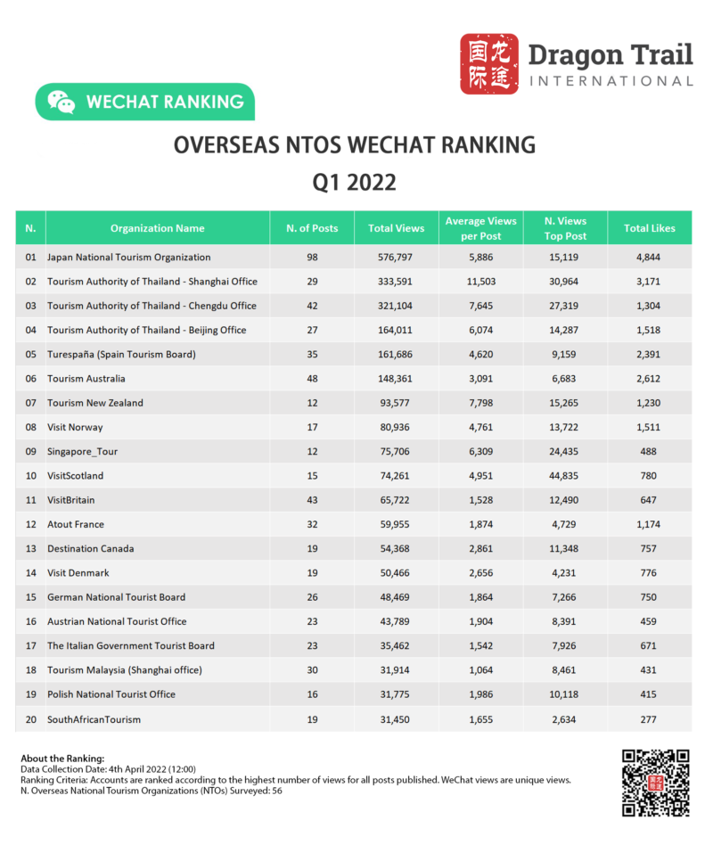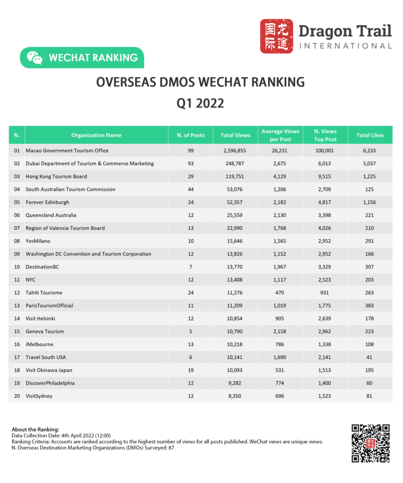 Dragon Trail’s WeChat Rankings Report for Q1 2022 examines and analyzes the performance of six categories of travel brands on WeChat: national tourism organizations (NTOs), destination marketing organizations (DMOs, referring to regional and municipal tourism boards), airlines, cruise lines, museums and attractions, and hotels.