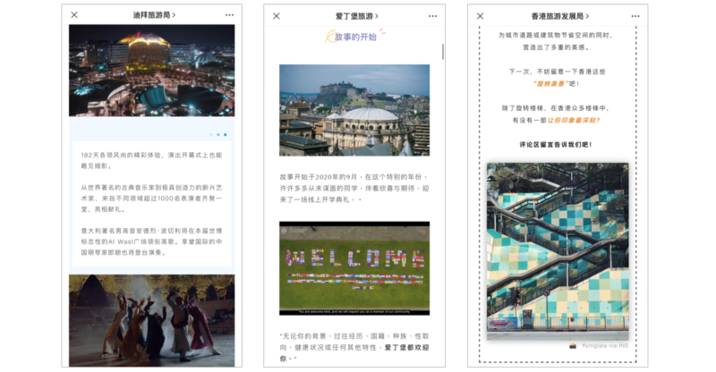 Left to right: Dubai promoted Expo 2020 in the lead up to the exhibition’s opening; Edinburgh’s student- and UCG-centered post attracted more than 20k views; Hong Kong revealed artsy spots for photography around the city