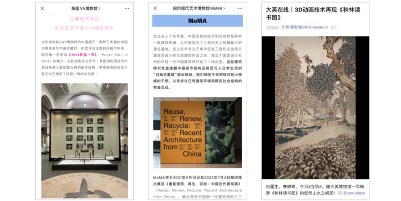 WeChat readers responded positively to international museums engaging with Chinese art and design. From left to right: V&A Museum, Museum of Modern Art, British Museum