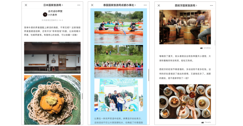 Left to right: A feature on soba noodles in Japan; One of the Tourism Authority of Thailand’s offline events in Chengdu; A popular article on life in Spain