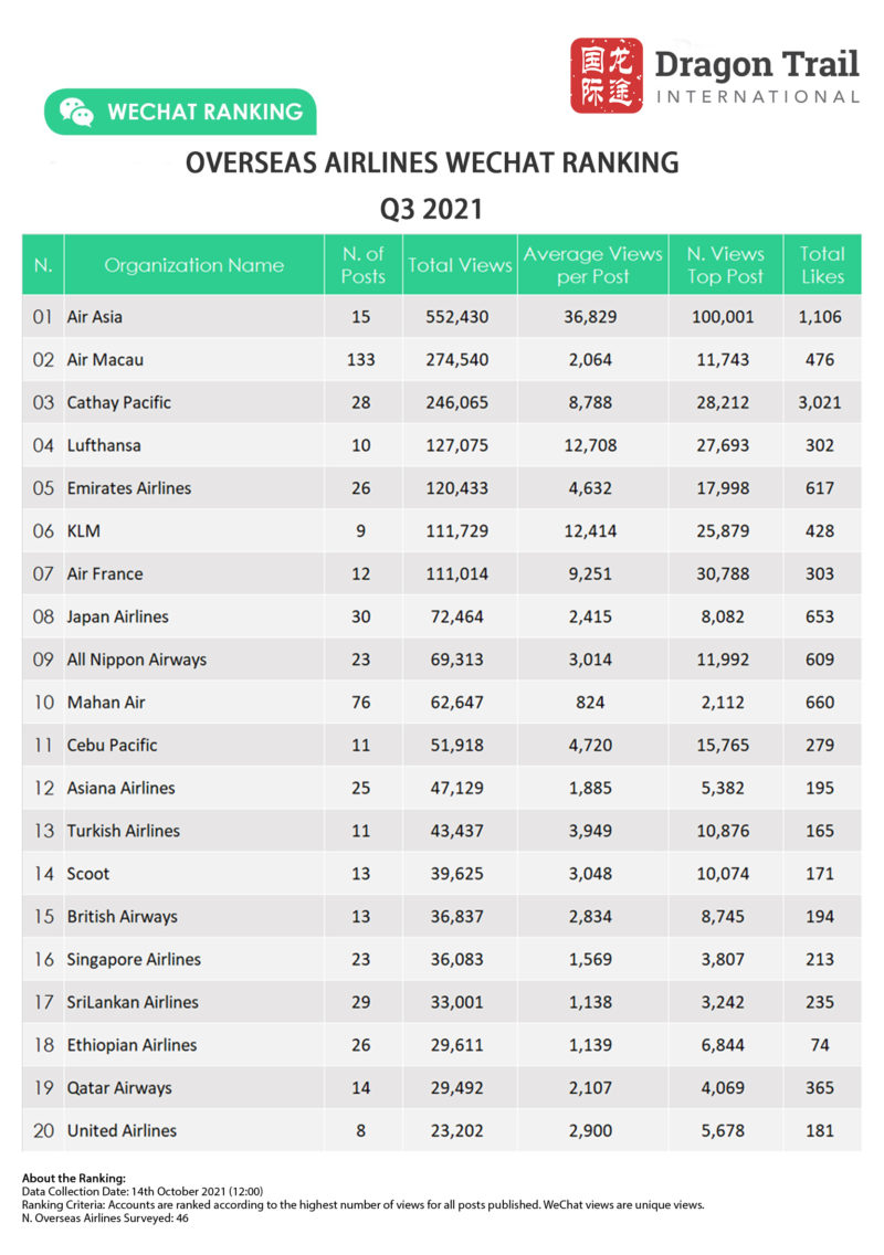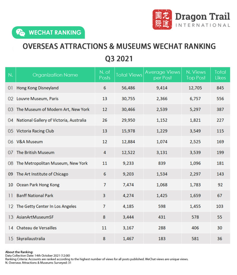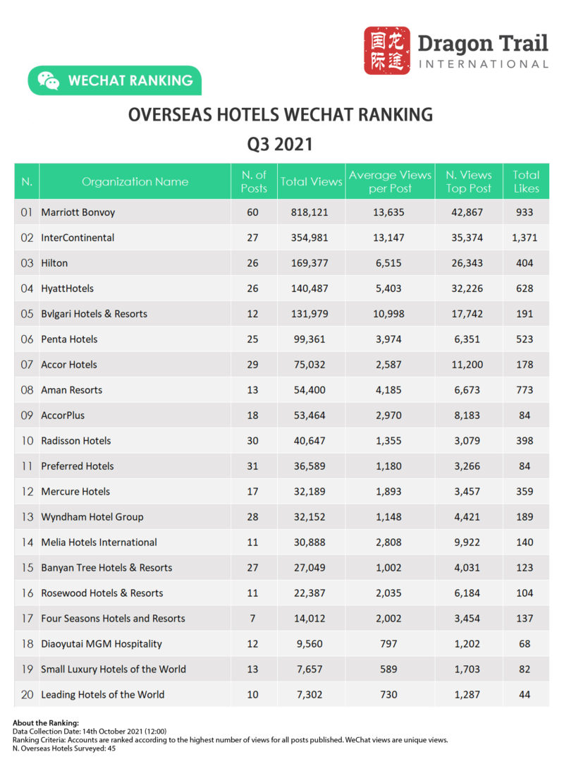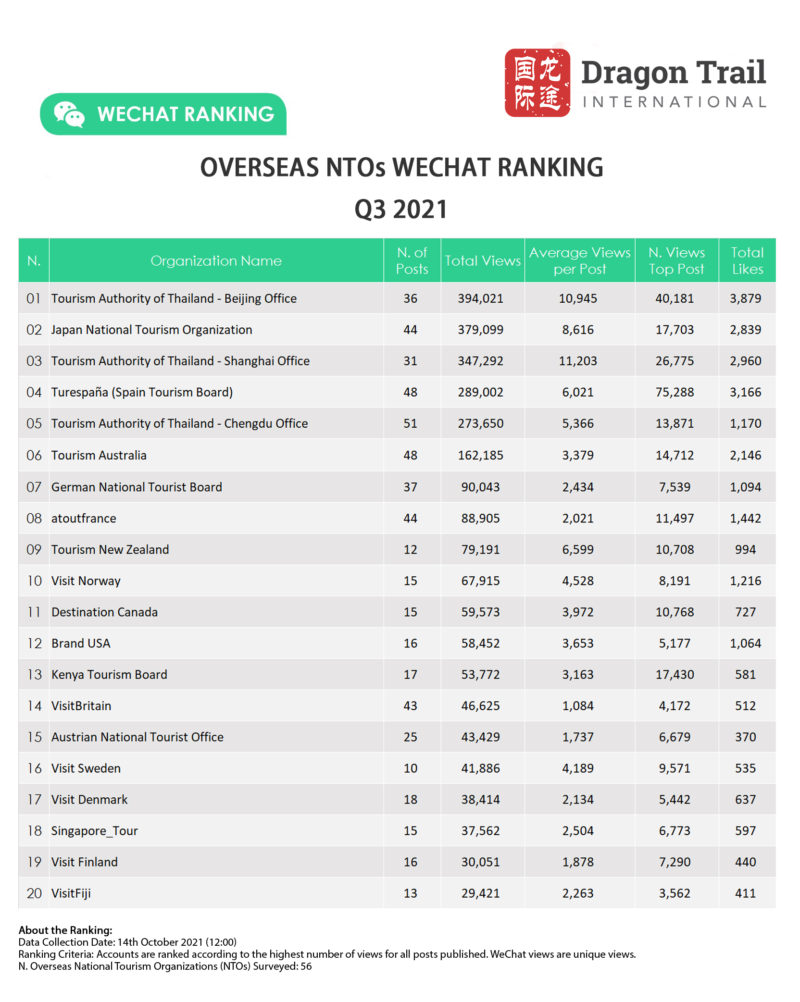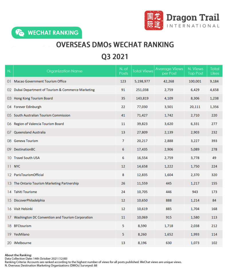 Dragon Trail’s WeChat Rankings Report for Q3 2021 examines and analyzes the performance of six categories of travel brands on WeChat: national tourism organizations (NTOs), destination marketing organizations (DMOs, referring to regional and municipal tourism boards), airlines, cruise lines, museums and attractions, and hotels. Amid continuing international travel restrictions, WeChat stands out as a communications channel for important information on changing rules, cancellations, and safety protocols, as well as a source of inspiration for destinations and attractions.