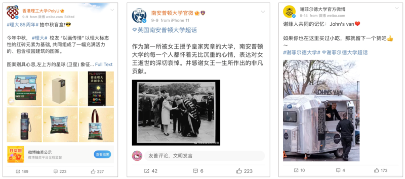 Most-liked Weibo posts by universities included Hong Kong Polytechnic University’s blind box giveaway, Southampton University’s tribute to Queen Elizabeth II, and Sheffield University’s post about a food van