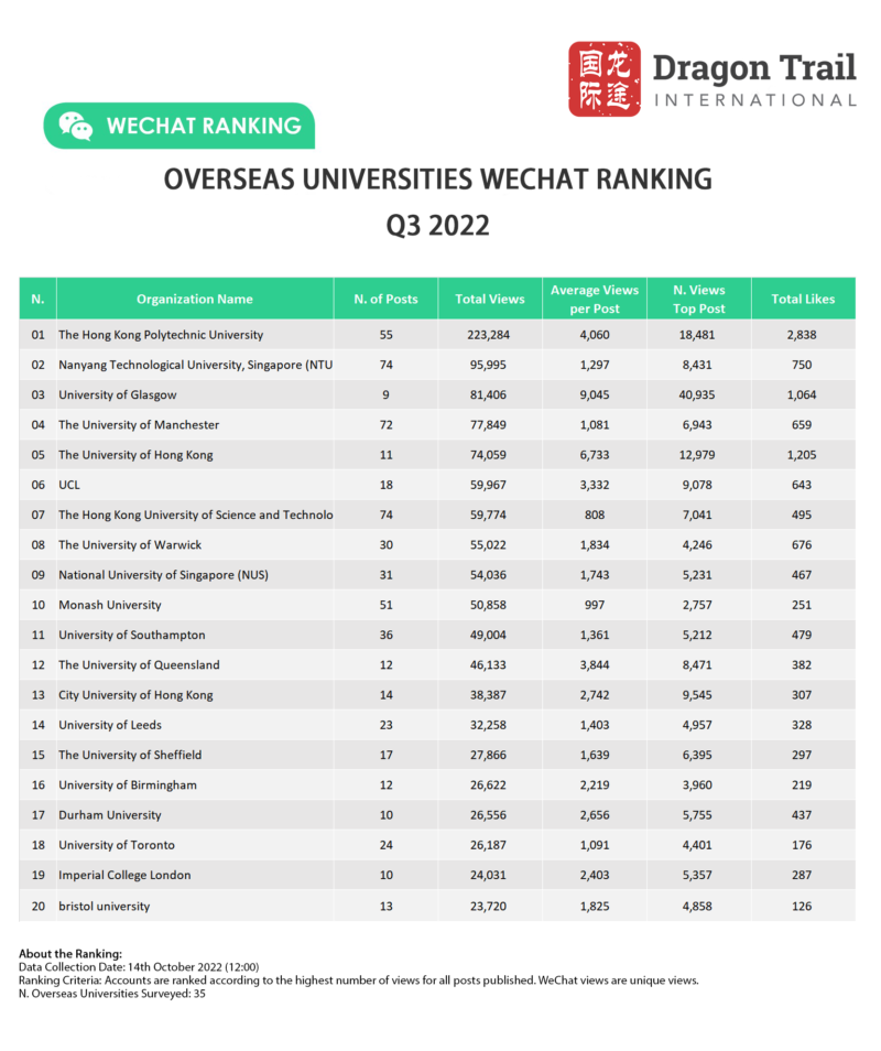 The top 20 WeChat accounts of overseas universities in Q3 2022 included 11 in the UK, four in Hong Kong, two in Singapore, two in Australia, and one in Canada.