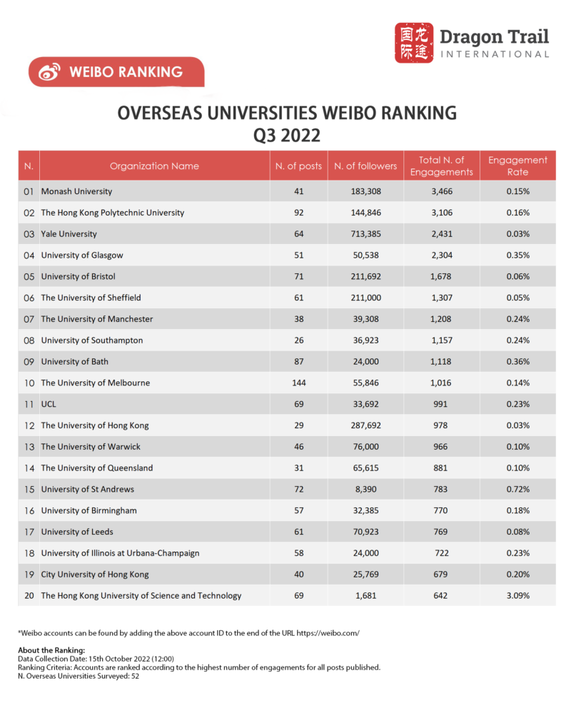 Since June 2022, Dragon Trail International has been tracking overseas universities’ social media marketing for China on WeChat and Weibo. Our first quarterly report offers a snapshot of the content trends and strategies used to communicate with prospective and current Chinese students and alumni. Based on data compiled from 38 active Weibo accounts and 33 active WeChat accounts of universities across 13 countries and territories in Asia, Europe, Oceania, and North America, the rankings also set the first objective industry benchmark for measuring the performance of higher education marketing for China.