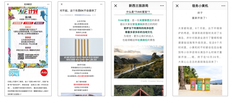Sustainable tourism-themed WeChat posts by (left to right) AirAsia, Emirates Airlines, Tourism New Zealand, and Cebu Pacific have all received positive responses in 2018 and 2019