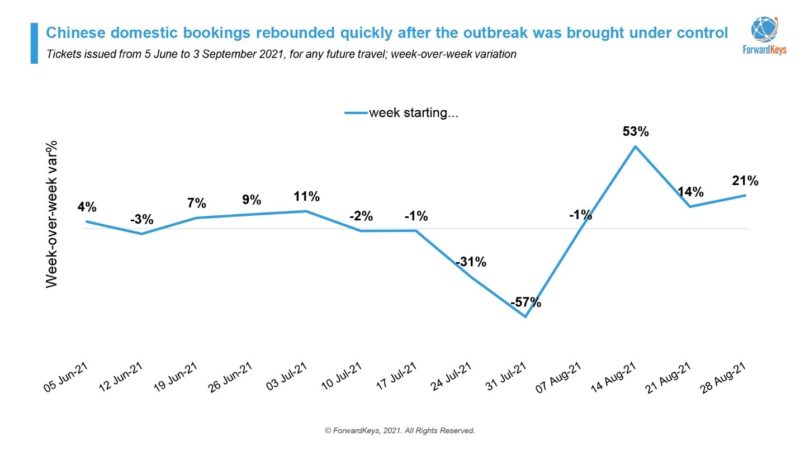 “We believed Chinese domestic travel would rebound quickly, as we saw that happen earlier this year. Lunar New Year travel was also badly affected by the outbreak of COVID but came back quickly when all high and medium-risk areas had been cleared in late February,” says Nancy Dai, China Market Expert at ForwardKeys.