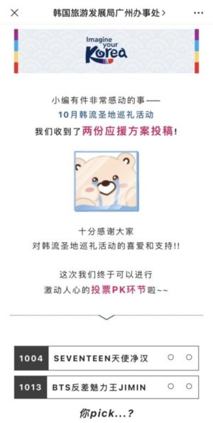 This article asked readers to vote for the pop idol they wanted featured at October’s monthly event at Korea Plaza in Guangzhou, supported by the tourism office. The choices were Seventeen’s Jeonghan and BTS’s Jimin. Jimin won with 51% of the vote.