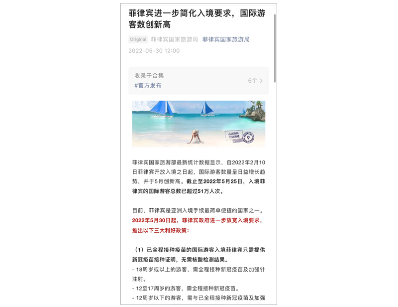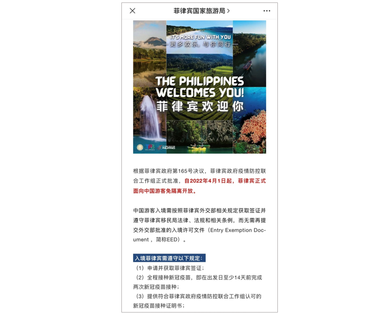 From 1 April 2022, the Philippines welcomed Chinese visitors with no quarantine requirements. The article set out the rules for entry into the country, including COVID vaccination and testing requirements.