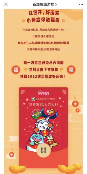 From 28-31 January, the Singapore Tourism Board released a limited number of cute, branded digital red envelope covers each day. At the same time, they also ran a Lunar New Year competition, with prizes for those who got the most likes for their comments on the STB WeChat post.