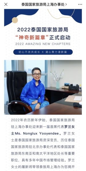The Tourism Authority of Thailand’s Shanghai office had the highest average views per post among any national tourism board on WeChat in 2022. Its top-performing article, launched Thailand’s Amazing New Chapters campaign with a WeChat Channels video, and introduced new Chief Representative Nonglux Yooyendee.