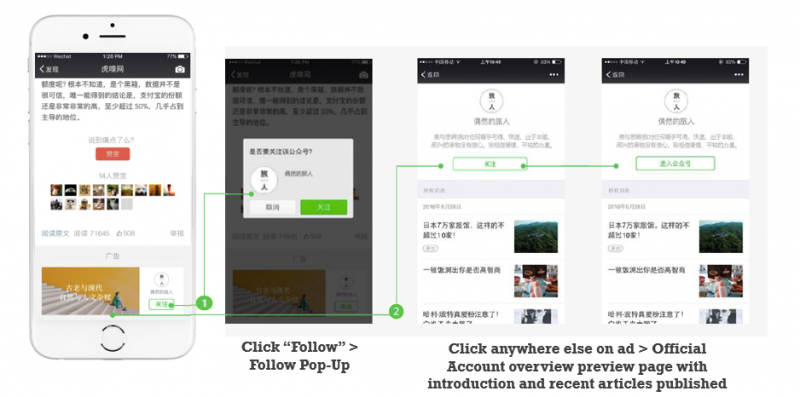 The purpose of these ads is to drive fan acquisition. Like official account ads, they are also banner ads displayed at the bottom of content published by a different official account. This ad format is best for organizations and companies that want to engage in more branding on WeChat and encourage long-term engagement. By clicking on different parts of the ad, users can either immediately follow your account, or they can click through to see your official account’s profile page, where they will be able to read your account description, and see the last three articles that you published. From there, they can decide whether they want to start following you.