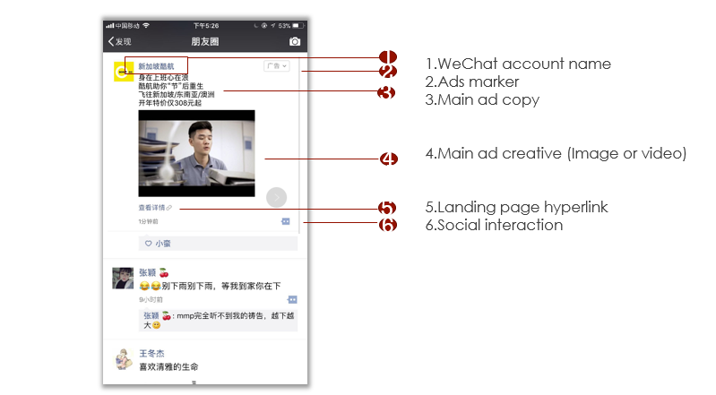 Ads include your account name and link, copy, creative – either a photo or video – a link to the promotion landing page on WeChat, and a social button that users can click to like or comment on a post. As of 2019, users can also tag their friends to share advertising content on WeChat. Advertising is also marked as such, with a small ‘ad’ marker in the top right corner.