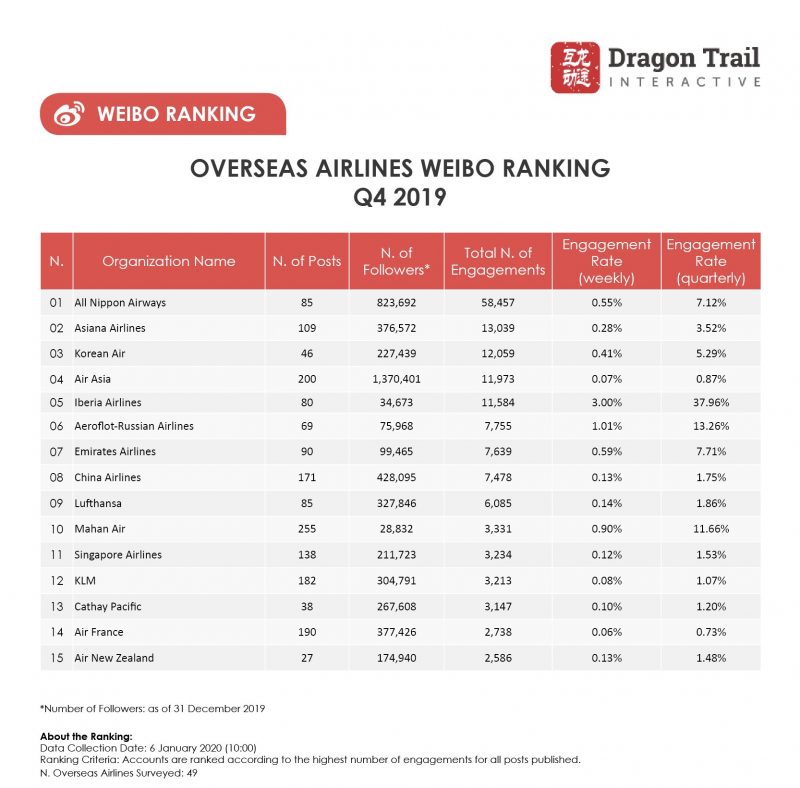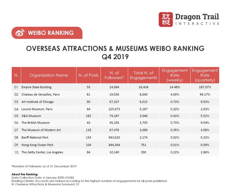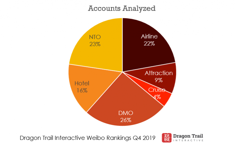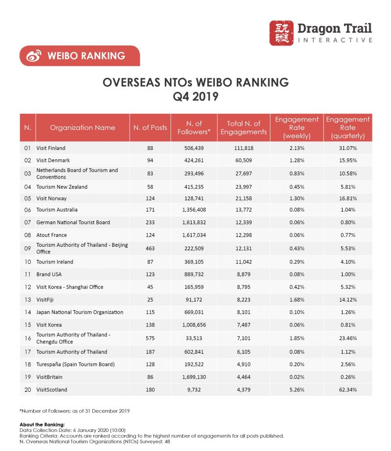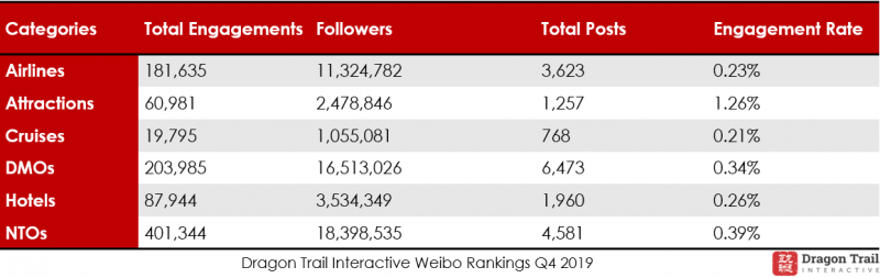 Dragon Trail Interactive began tracking travel brands’ accounts on Chinese social media platform Sina Weibo and publishing weekly rankings based on this data from September 2019. Our first quarterly report, for Q4 2019, covers the Weibo performance of tourism brands across six categories: National tourism organizations (NTOs), destination marketing organizations (DMOs), airlines, cruise lines, museums & attractions, and hotels. Like Dragon Trail’s WeChat Rankings for tourism boards, the Weibo Rankings set industry benchmarks, and reveal best practice for using Weibo as a tourism marketing tool by analyzing the best performing content strategies and leading themes.