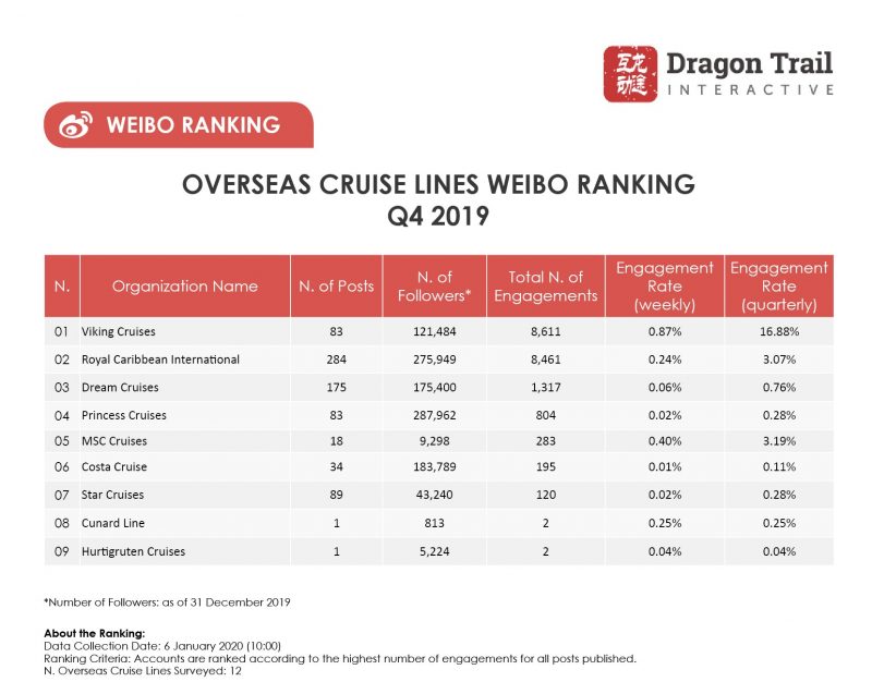 There are only nine cruise lines that posted at all in Q4 2019, and two of these only posted once each during the entire quarter. Engagement rates for this category are also very low. One reason could be content – cruise lines post a lot about their ships and the facilities on the ships, as well as some promotions, but not so many lucky draws as airlines, and no celebrity content. However, Viking Cruises did benefit from their short video promotion featuring economist Xue Zhaofeng, who can be understood better as a KOL than a “celebrity”. The only other post from the quarter than stood out for driving up category engagement was Dream Cruises’ sweepstakes with the promotional hashtag “It’s so hard to travel with the whole family” (#全家旅行的我太难了#).