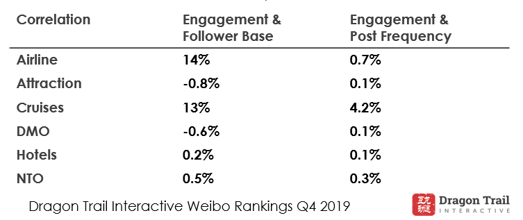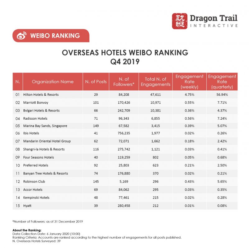 Dragon Trail Interactive’s first quarterly report for international tourism brands on Sina Weibo tracks and analyzes Q4 2019 performance for national tourism organizations (NTOs), destination marketing organizations (DMOs), airlines, cruise lines, museums & attractions, and hotels. The data reveals that celebrity content is the most effective way to stimulate engagement on Sina Weibo, but that this engagement does not always indicate true interaction with the brand or its related content. KOL promotions, giveaways, asking questions, and other popular content can do more to get fans actually engaged with tourism brands online. As the first report of its kind, these Weibo Rankings set industry benchmarks for posting activity, engagement, and engagement rates, by which to evaluate future Weibo performance.