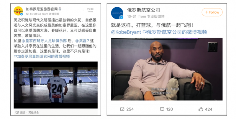 Sports-related content, like these short videos from the Catalan Tourist Board (left) and Aeroflot, is popular on Weibo
