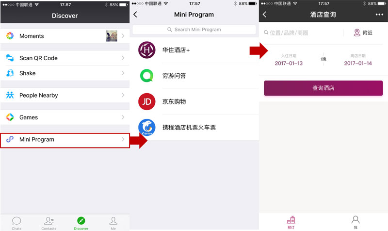 1. Low frequency use: According to Tencent mini programs’ advantage is that they can be used “just when you need them”. With less than 1M of memory, mini programs provide a similar experience to native apps, but do not take up as much memory. Ctrip’s app is 114.6MB versus the 1MB of the mini program. Some functionalities such as booking international flights is currently unavailable, but this might change in the near future.