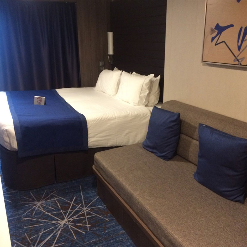 Finally, you pass through a doorway with ‘Norwegian Joy’ written on a digital screen above. This is where the fun starts. You walk down a long corridor with views of the ship you are about to embark, a behemoth of a vessel that can carry 5,000 people, bright white and emblazoned with a red bird and swirling yellow and blue clouds. The selfies begin in earnest. Then you cross a bridge and you are on the ship! The staff is dancing and jumping and greeting you with enthusiasm. First impressions on board are lush, multi-patterned carpets and golden elevators.