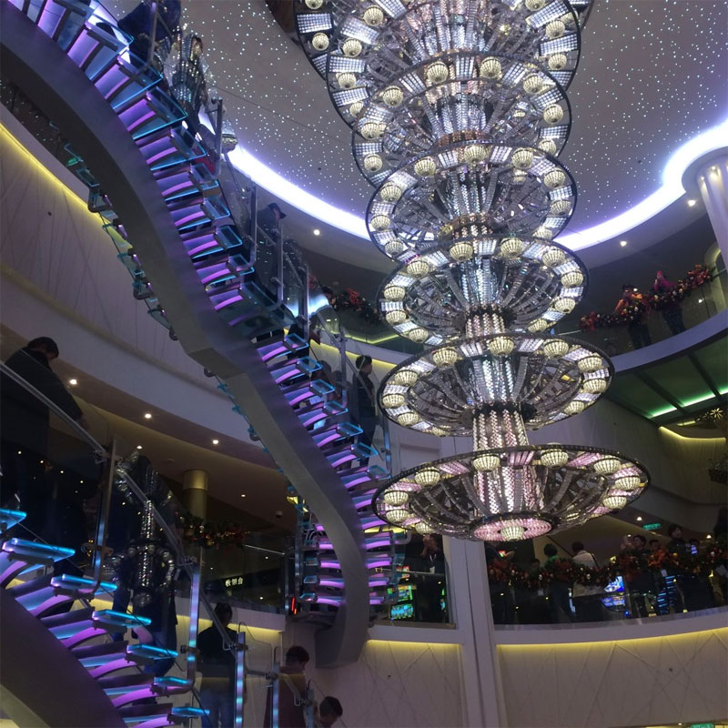 That night we explored the ship. We passed by the Italian restaurant and a gym, and a hallway art gallery, and arrived at the glossy black and golden doors of an “American-style steakhouse” and looped back through duty free, which was gleaming white, with cosmetics and watches and diamonds at different counters. In the center of the ship between the 8th to 6th floors, there is a glass spiral staircase and an impressive elongated chandelier that were both a different color or combination of colors every time I passed by.