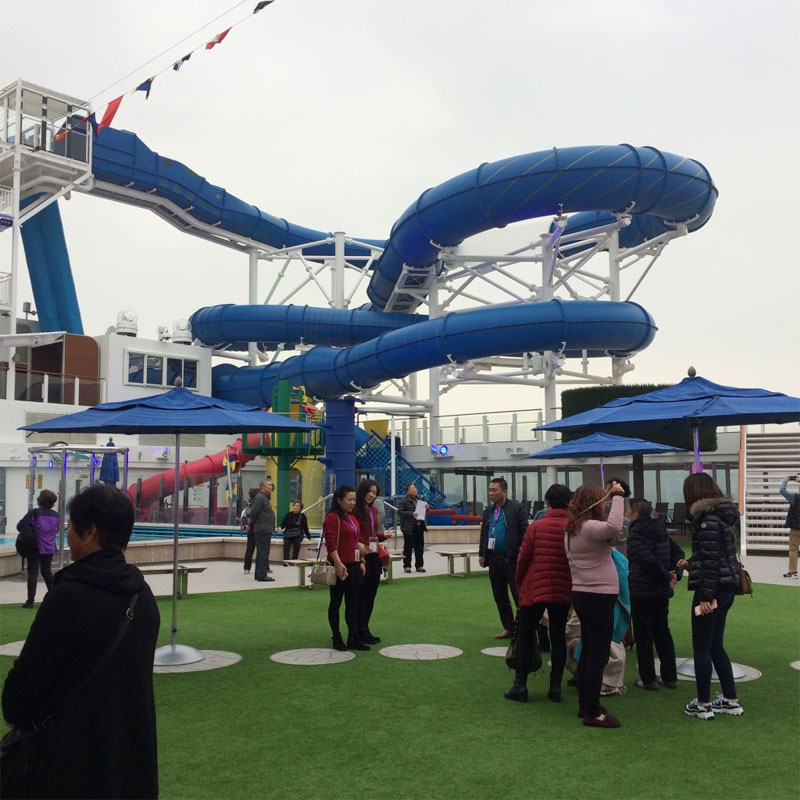 Outside the buffet restaurant on the 16th floor was a large open-air deck with astroturf and croquet, as well as a huge blue water slide that veered off the edge of the ship in one place where it went clear. There was an assortment of small swimming pools and hot tubs, and these really did get used, especially during the day. At the very top of the ship was a popular go-karting track.