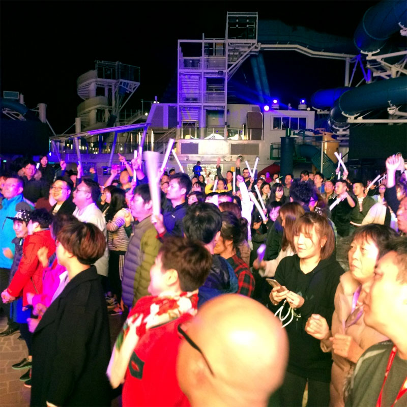Dancing is a popular activity on board Norwegian Joy. The evening after departing from Okinawa, we wandered out onto the 16th floor deck to find ourselves in the midst of a dance party. Professional dancers and an MC moved enthusiastically around a stage area, while the deck was packed with passengers. Lights flashed. Middle aged women and men waved glow sticks, clapped their hands and bounced up and down to electronic dance music, some with their faces painted with phosphorescent patterns. I found myself smiling at one woman who looked close to 80 years old, with bobbed, permed hair and a green cardigan. But my smirking turned to a mix of shame and admiration when I calculated that while my 20s were spent partying freely around the world, hers had taken place during an era of famine and political upheaval. What an experience it must be for someone growing up during times of hardship to dance aboard a luxury cruise ship and indulge in all-you-can-eat plates of shrimp. After my change of heart, I attached myself to a conga line, and in the end, the party seemed to end all too soon.