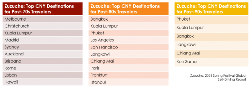 Zuzuche’s data shows that the older the traveler, the more likely they are to travel to long-distance locations. Destinations in Oceania were particularly popular with travelers born in the 1970s, while post-90s consumers stayed closer to home around Southeast Asia.