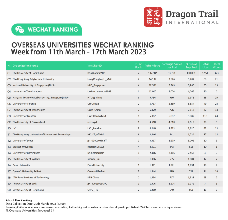 WeChat ranking criteria: Accounts are ranked according to the highest number of views for all posts published. WeChat views are “unique views”.