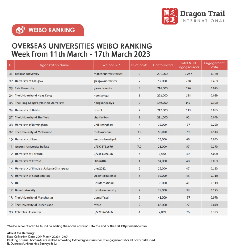 Weibo ranking criteria: Accounts are ranked according to the highest number of engagements for all posts published.