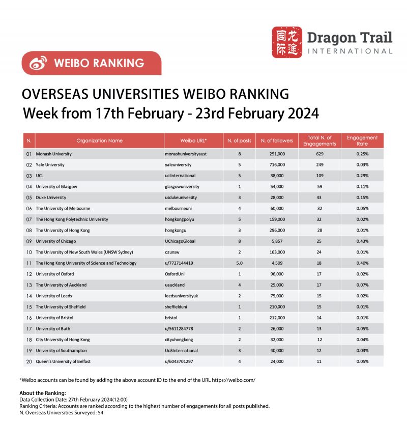 Weibo ranking criteria: Accounts are ranked according to the highest number of engagements for all posts published.