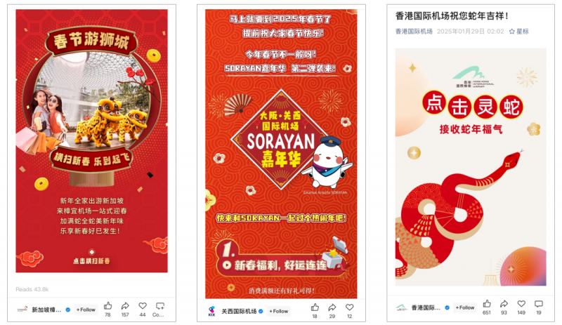 The top Q1 2025 WeChat posts by Hong Kong International Airport, Singapore’s Changi Airport, and Osaka’s Kansai Airport were all related to Chinese New Year. Hong Kong’s was an animated and musical greeting with snakes, Spring Festival couplets, red envelopes, and WeChat stickers. Changi offered phone wallpapers, giveaways, and discounts in airport venues. Finally, Kansai Airport attracted views by giving away prizes featuring SORAYAN, its cute airplane mascot.