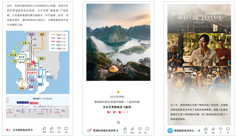 (Left to right) Japan National Tourism Organization’s useful guide to South Kyushu; The Scandinavian Tourism Board announces the return of Beijing-Oslo flights; The Tourism Authority of Thailand uses Lisa’s role in The White Lotus to promote luxury hotels