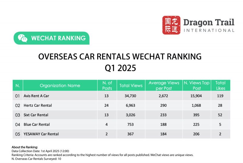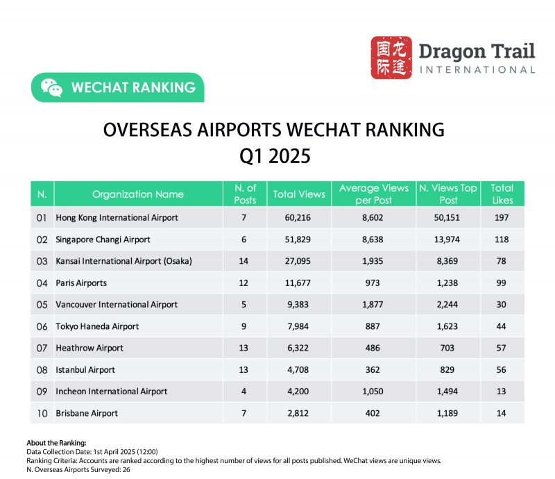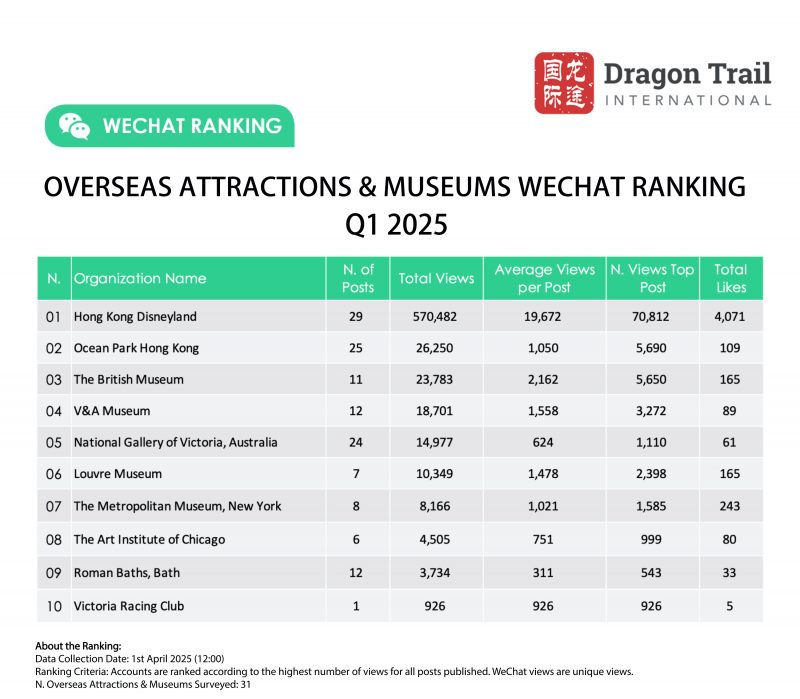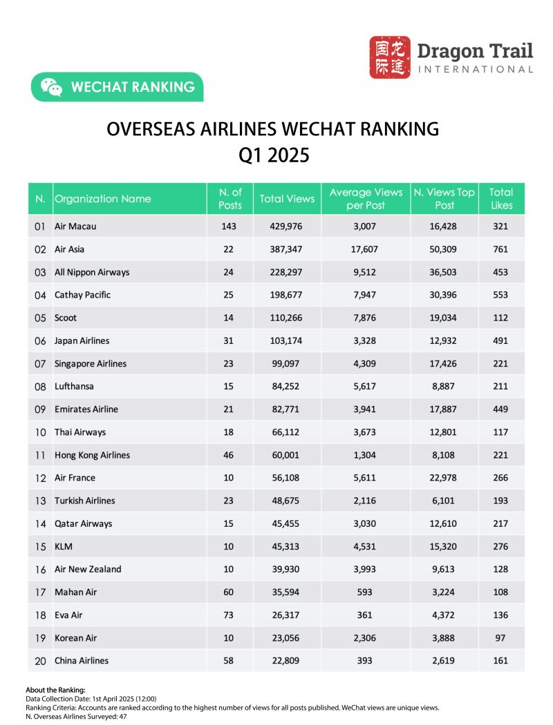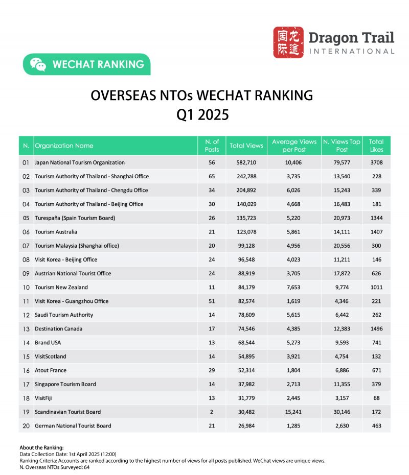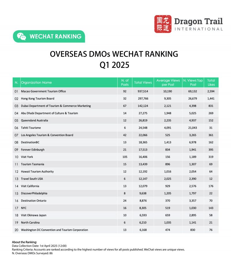Dragon Trail’s WeChat Rankings Report for Q1 2025 examines and analyzes the performance of eight categories of travel brands on WeChat: national tourism organizations (NTOs), destination marketing organizations (DMOs, referring to regional and municipal tourism boards), airlines, cruise lines, museums and attractions, hotels, airports, and car rental companies.