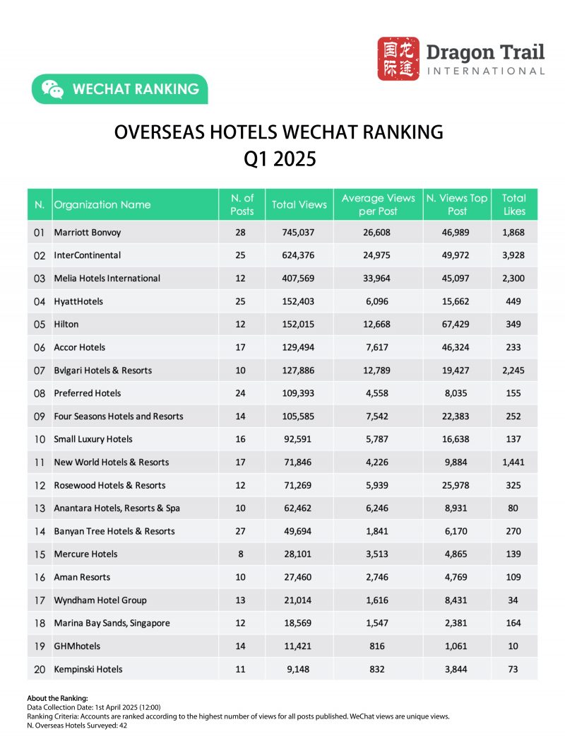 Ranked 3rd for total views and 1st for average views per post, Melia Hotels received more than 45k views for a post about 18 new properties opening around the world in 2025, from Vietnam to Albania to Cuba. Melia’s second-most read article promoted Valentine’s getaways at a number of domestic Chinese properties.