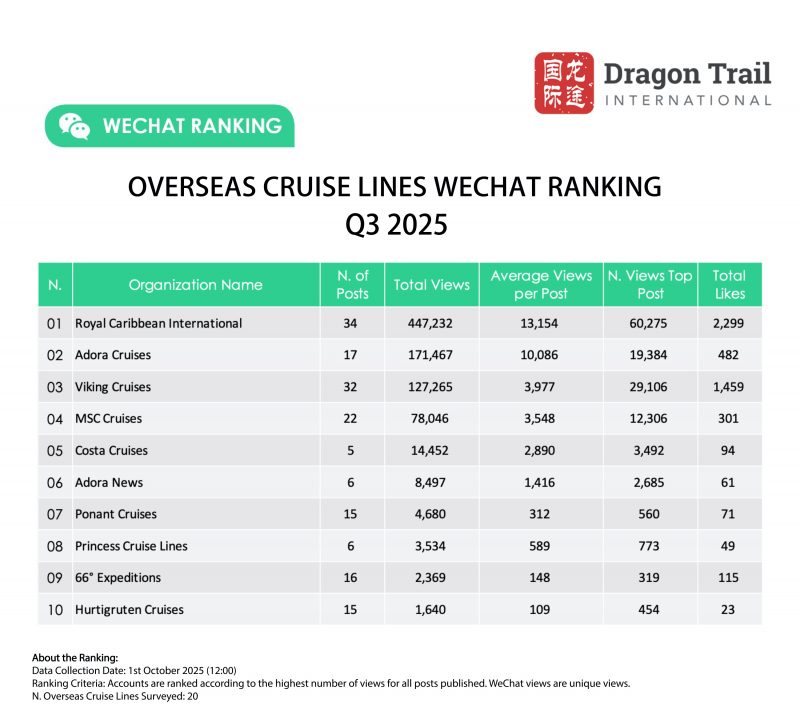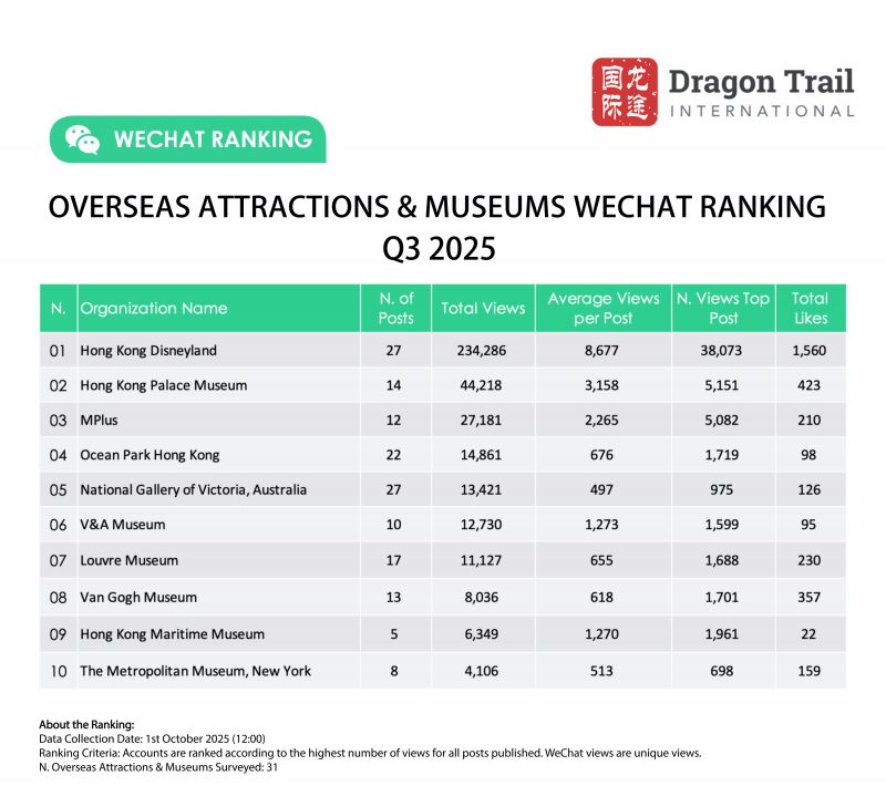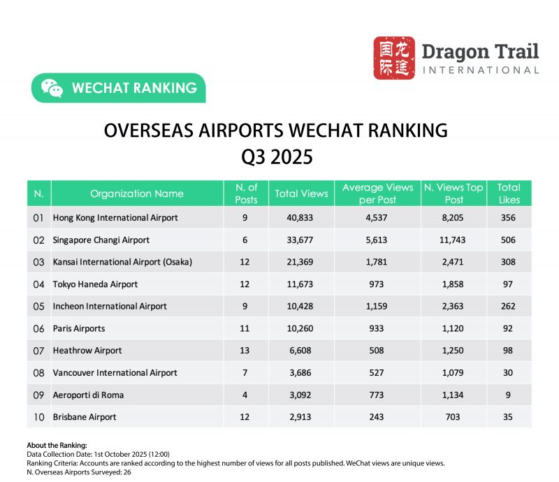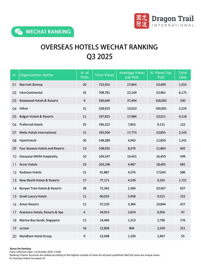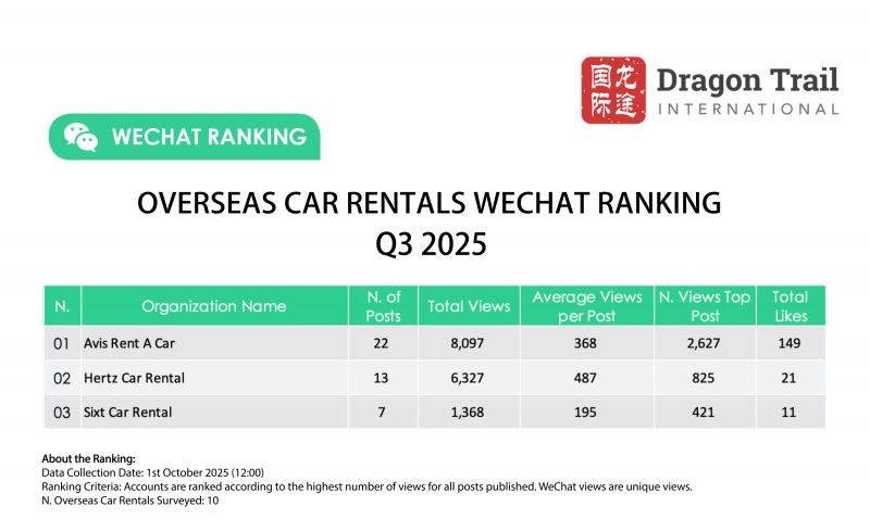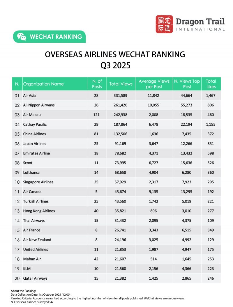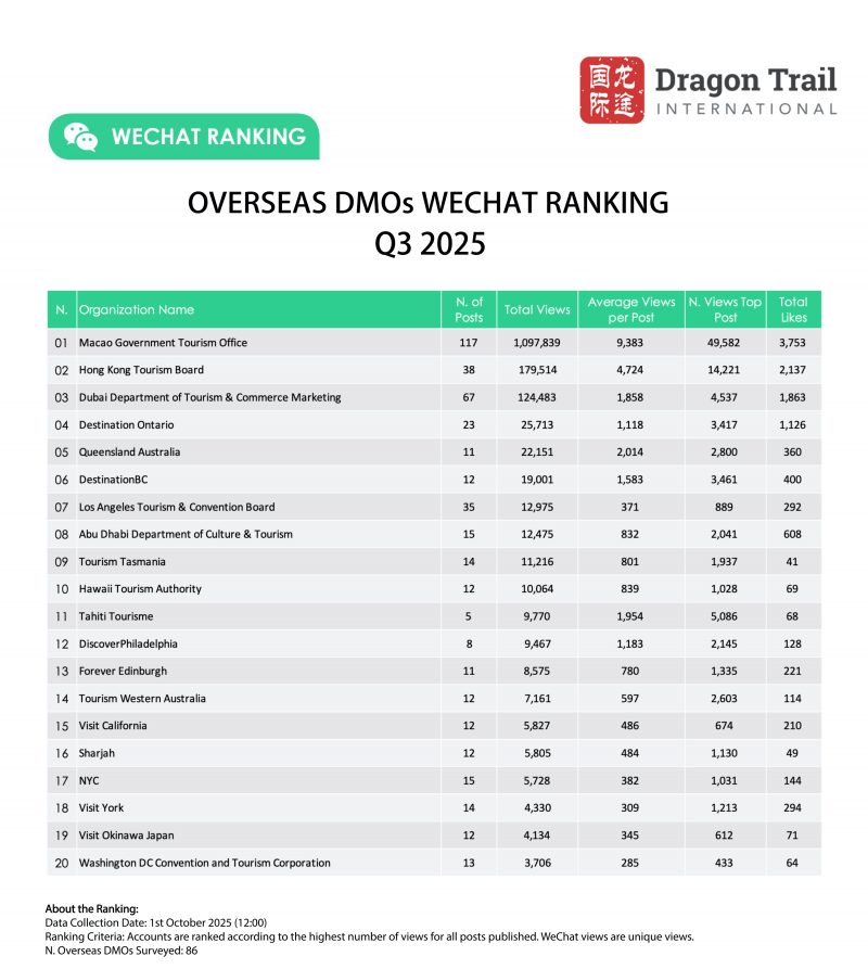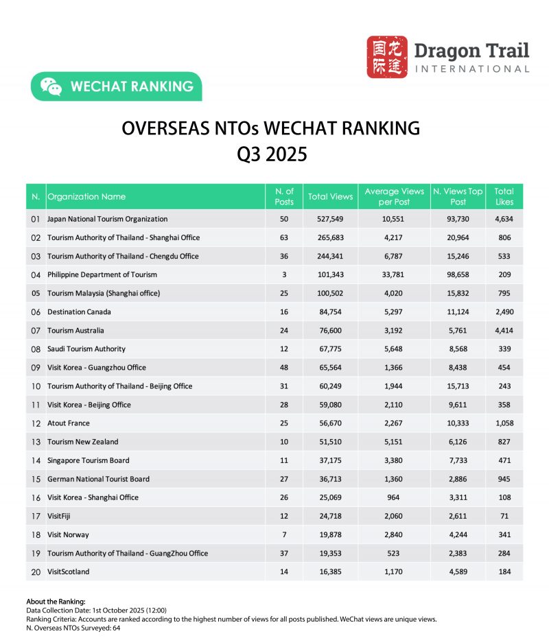 Dragon Trail’s WeChat Rankings Report for Q3 2025 examines and analyzes the performance of eight categories of travel brands on WeChat: national tourism organizations (NTOs), destination marketing organizations (DMOs, referring to regional and municipal tourism boards), airlines, cruise lines, museums and attractions, hotels, airports, and car rental companies. The report is based on data collected by Dragon Trail on a weekly basis, and aims to provide industry benchmarks and track trends in WeChat content marketing for overseas tourism brands. Dragon Trail has been collecting weekly data on NTOs, DMOs, airlines and cruise lines since 2017, with the hotels and attractions categories added in 2018, and airports and car rental companies from Q2 2024.