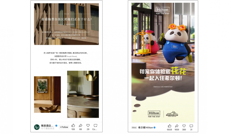 Hilton also published two articles with more than 100k views each. One was a collaboration with Panda Creation, with panda-themed rooms, blind boxes, and other promotions featuring Hua Hua the giant panda. The other article was about traveling with pets, highlighting Hilton’s Chinese properties where guests can stay together with their pets – a new and niche trend for the Chinese travel market.