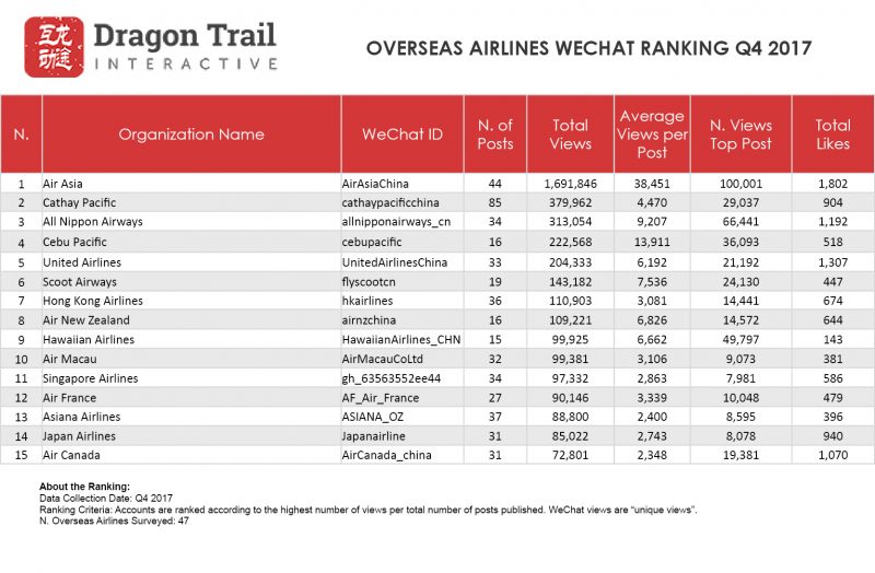 Every single quarter of 2017, with the exception of Q4, the quarterly rankings were the same, with Air Asia in first place, Cathay Pacific in second, and Cebu Pacific in third. The only change came in the last quarter, when All Nippon Airlines – which had been climbing the rankings slowly but surely all year – came in third. Their strategy is not unlike other airlines, with most posts about discounted tickets to Japan – one of the top destinations for Chinese outbound tourism, including promotions on flights from 2nd tier Chinese cities like Shenyang and Qingdao.