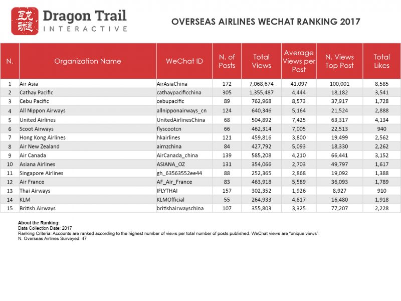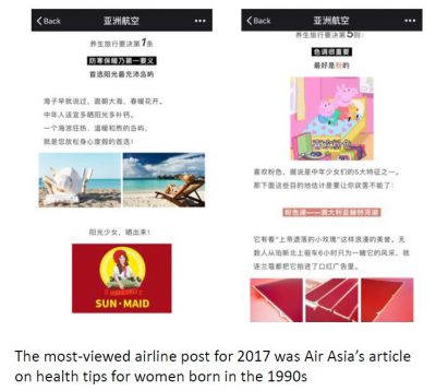 There is one clear champion of the airline category – or any travel brand – on WeChat, and this is Air Asia. In 2017, the account got over 7 million total views, and an average of 41,097 views per post. Compare this to the second most popular airline account, Cathay Pacific. They got less than 1.4 million views in total, with an average of only 4,444 views. The second most popular account in terms of average post views is Cebu Pacific, which is still very far behind Air Asia, with an average viewership of 8,583.