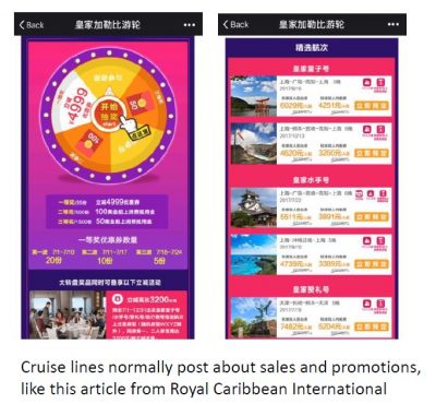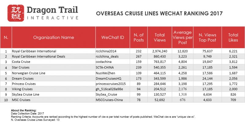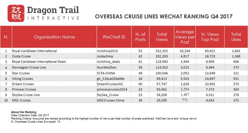 The top cruise line post of Q4 was a sales campaign from Royal Caribbean International, which was published during the first week of October – one of China’s ‘Golden Week’ holiday periods – and got over 60,000 views. Although this and most other cruise line WeChat posts are sales promotions, with the occasional article about itineraries or facilities, by far the most viewed cruise line post of the year was more political in nature. In March, 2017, Royal Caribbean got over 75,000 views for its announcement about cutting South Korea from its itineraries, to stay in line with official Chinese policy banning group tours and cruises to South Korea as retaliation for South Korea’s deployment of the US defense system, THAAD.