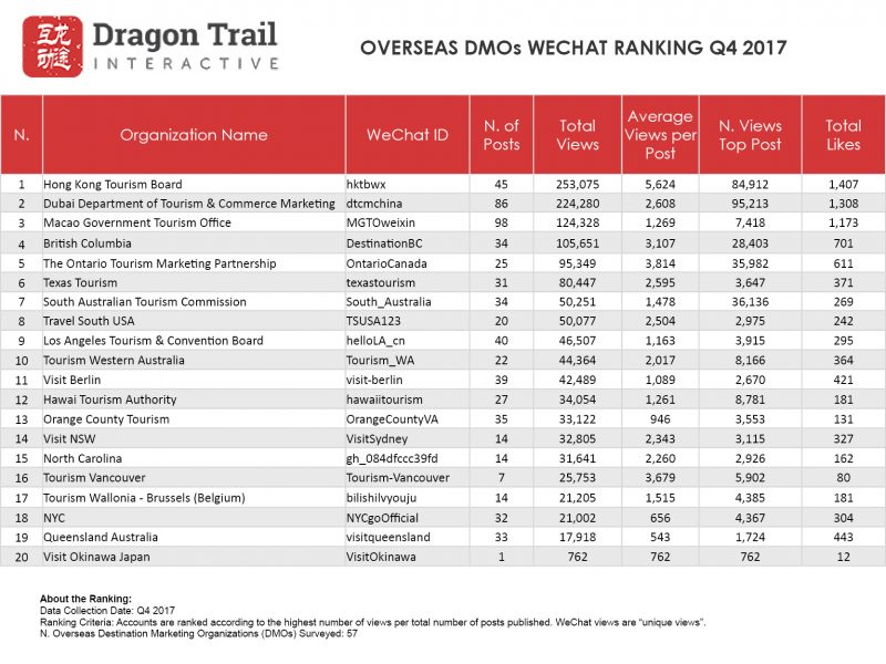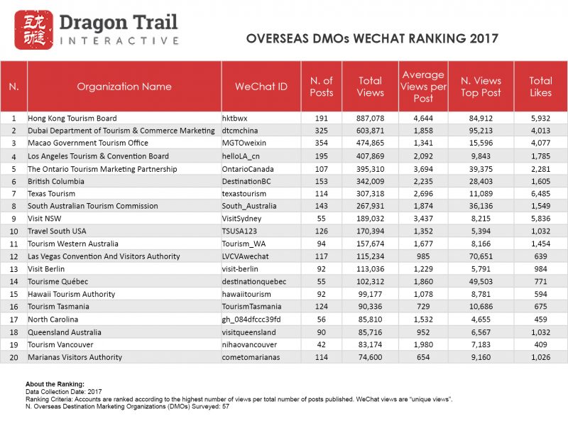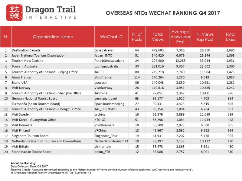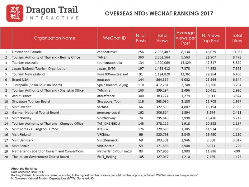 With nearly 1 billion monthly active users, Chinese social media platform WeChat has become an increasingly important digital marketing channel for reaching Chinese consumers. But with no comparative analysis of travel brands that are using this platform, it is difficult to understand which kinds of accounts and content are performing best. With this in mind, Dragon Trail Interactive began tracking WeChat posts for a weekly ranking of NTOs, DMOs, airlines and cruise lines from the start of 2017. One year later, we’ve learned a lot about the top accounts in each category, the kinds of content that resonates best with WeChat’s users, and strategic considerations that can make a huge difference.
