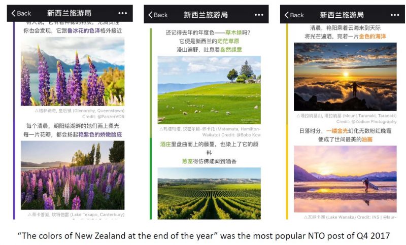 The top NTO post of Q4 2017 was an article called ‘The colors of New Zealand at the end of the year’, which got 33,934 views by 17th December. As of February 2018, this has risen to 38,495 views. The post takes viewers on a rainbow-colored tour of New Zealand, from purple flowers and green hills, to blue skies and orange sunsets. In this way, the article very much follows the trend we’ve seen all year of posts with beautiful nature photography doing the best on WeChat. The other top posts of the year include “Escape summer for winter Down Under” by Tourism Australia, celebrations for Canada’s 150th birthday by Destination Canada, and a guide to viewing cherry blossoms in Japan. See our list of the top 5 NTO posts of 2017 here.