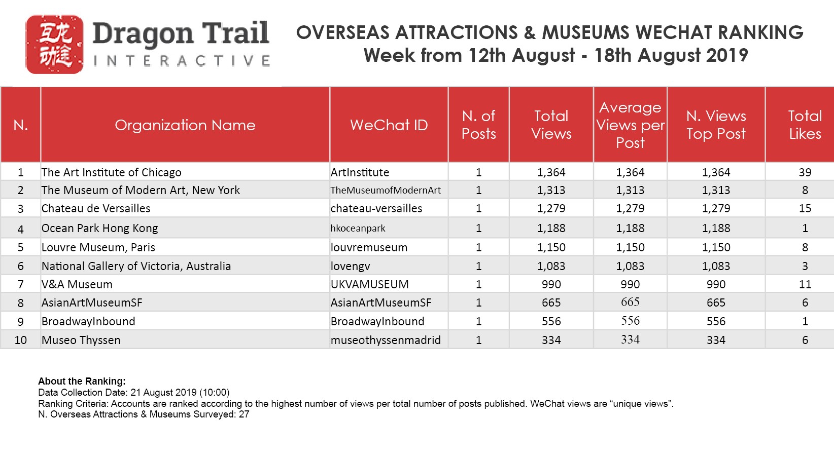 The top-ranking WeChat accounts for travel destinations, airlines, cruise lines, museums & attractions, and hotels, for the week of 12 August-18 August, 2019.