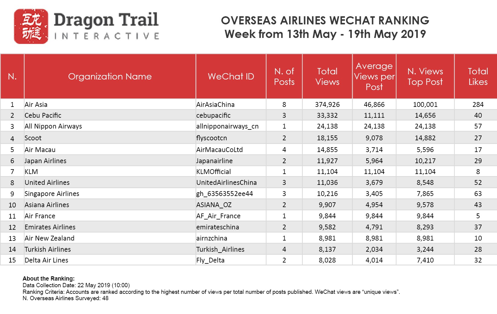 WeChat Weekly Rankings: Destinations, Airlines, Cruises, Attractions and Hotels – 13 May – 19 May 2019