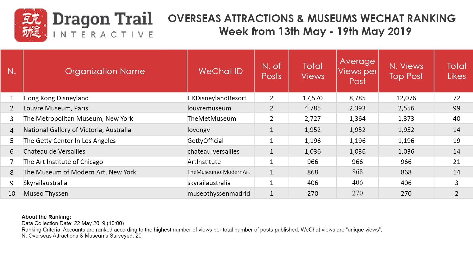 The top-ranking WeChat accounts for travel destinations, airlines, cruise lines, museums & attractions, and hotels, for the week of May 13-19, 2019.