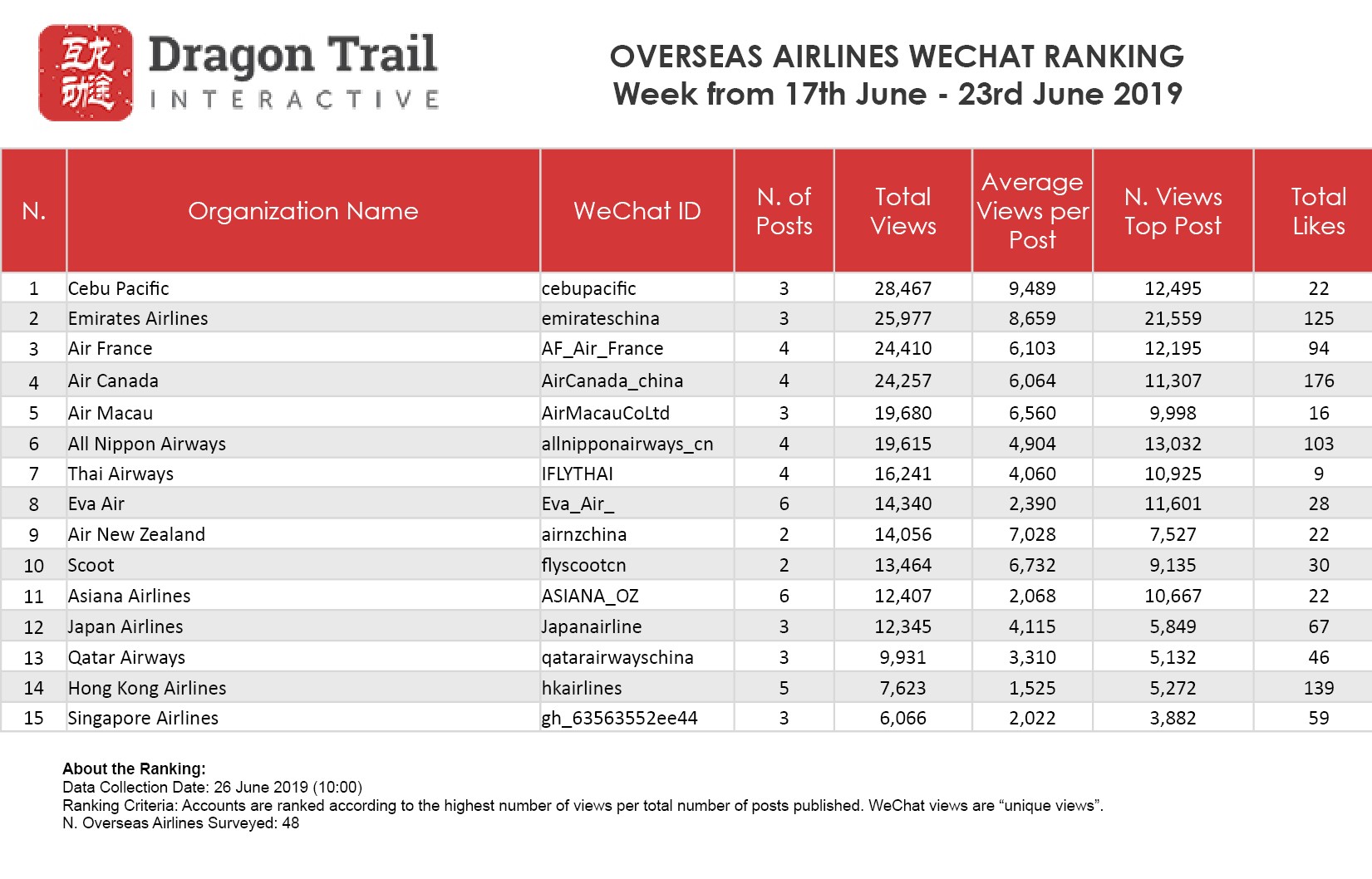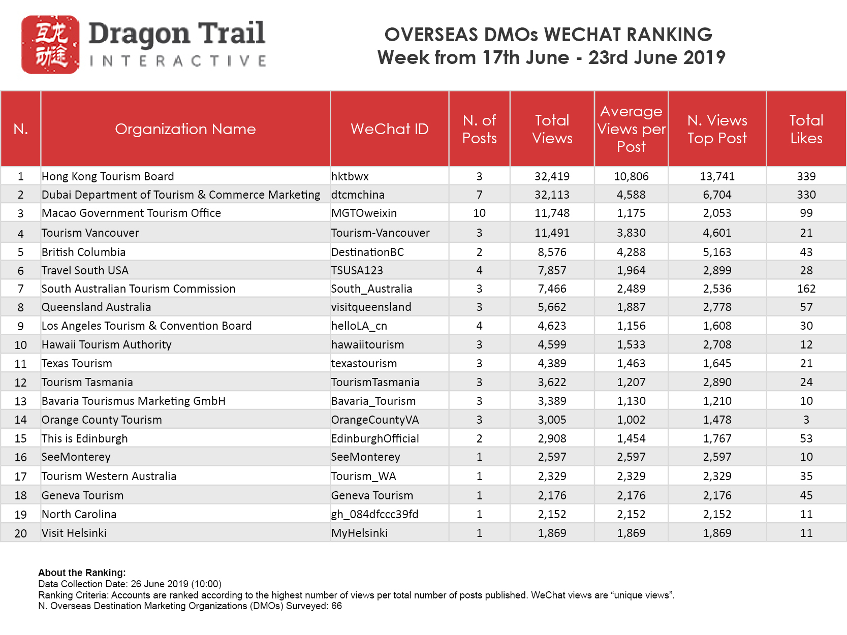 WeChat Weekly Rankings: Destinations, Airlines, Cruises, Attractions and Hotels – 17 June – 23 June 2019